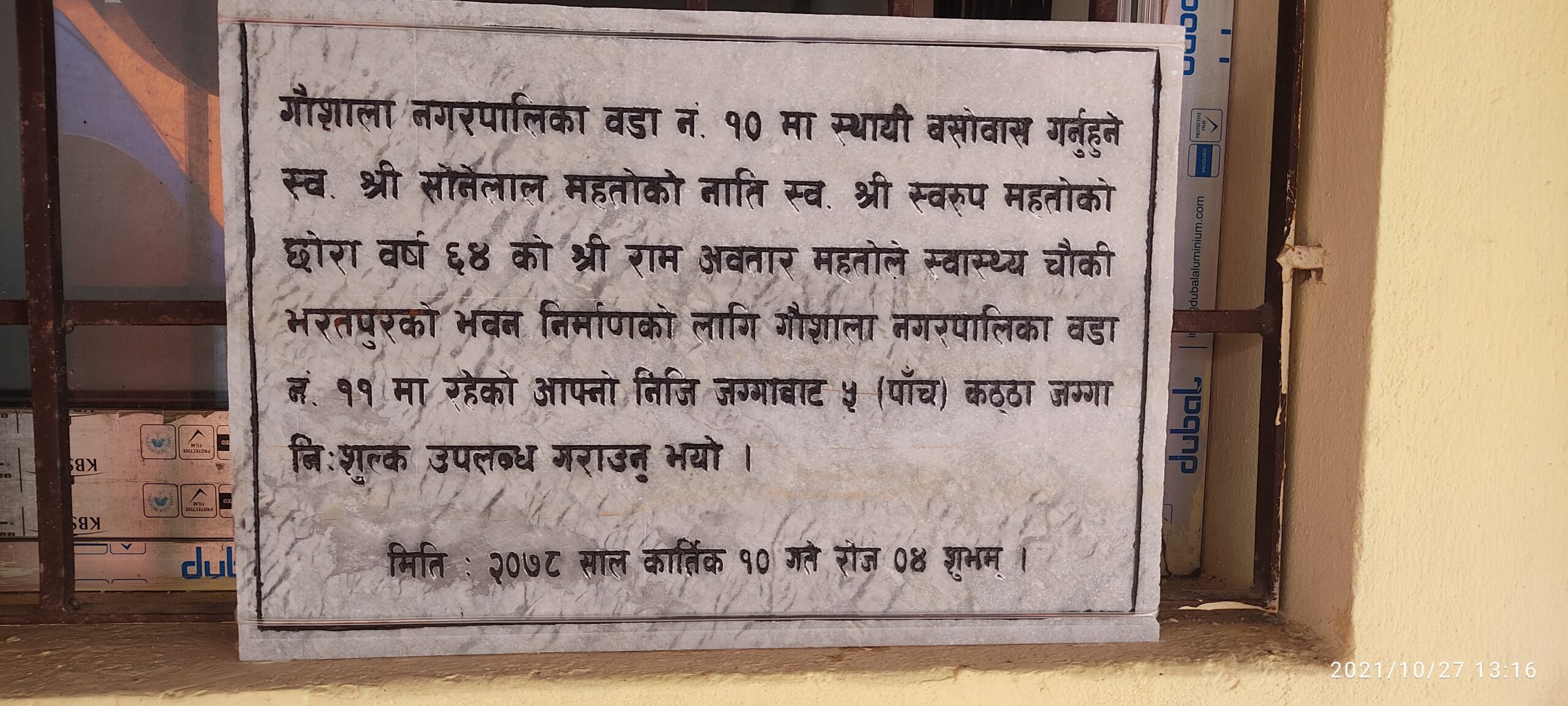 नगरस्तरीय स्वास्थ्य र शिक्षालाई जनमैत्री बनाउन, चुस्तदुरुस्त सेवा प्रदानका लागि नगरपालिका तयारी गरिदै आएको छ ।’हेम सावित्री जेभी कम्पनीले २ करोड १३ लाखको लागतमा निर्माण भएको सो स्वास्थ्य चौकी निर्माणको लागि स्थानिय रामऔतार महतोले ५ कट्ठा जग्गादान गर्नुभएको थियो ।कार्यक्रमका बीच नगर प्रमुख महतोले भवन निर्माणका लागि जग्गादान गर्ने जग्गादाता दम्पति परिवारलाई दोसल्ला उढाएर सम्मान गरे। कार्यक्रमकावीच जग्गादाता रामऔतार महतोले मुस्कुराउँदै आफनो सपना पुरा भएको प्रतिक्रिया दिएका छन् ।