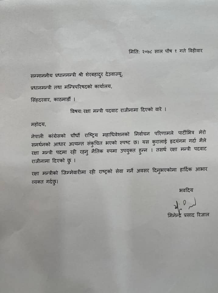 प्रधानमन्त्री देउवाले रिजाललाई असोज २२ गते रक्षामन्त्रीमा नियुक्त गरेका थिए ।
