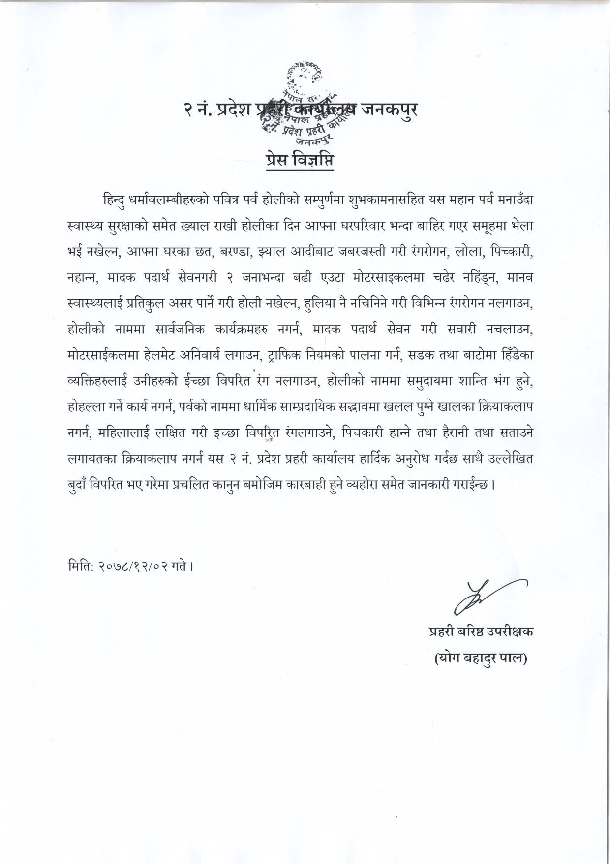 बुधवार २ नम्बर प्रदेश प्रहरी कार्यालय जनकपुरका प्रहरी वरिष्ठ उपरीक्षक योग बहादुर पालले एक सूचना जारी गर्दै स्वास्थ्य सुरक्षाको ख्याल राखी होली मनाउन आग्रह गरेको छ ।