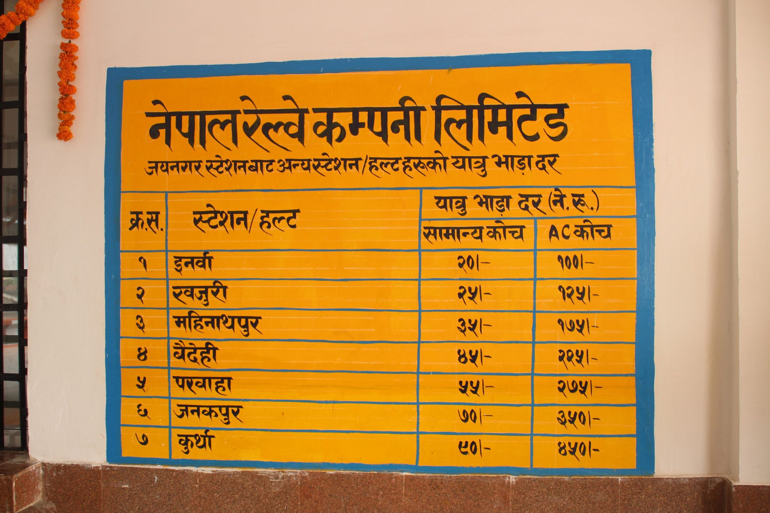जयनगरदेखि कुर्थासम्म चल्ने रेल सेवाको भाडादर कायम गरिएको छ । जनकपुर–कुर्था–जयनगर सामान्य सिटमा प्रतियात्रु रु ९० र एसी सिटमा रु ४५० भाडा निर्धारण गरिएको छ । जयनगर–कुर्थासम्मको दूरी करिब ३५ किलोमिटर छ ।