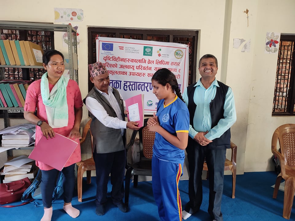 बुधबार महोत्तरी बर्दिवासको वडा नं.१४मा आयोजित सो कार्यक्रममा व्रेल लिपिमा तयार गरिएको“जलवायु परिवर्तन,यसका प्रभाव र अनुकलनका उपायहरु” सम्बन्धी जानकारी मुलक पुस्तक वितरण गरीएको हो ।