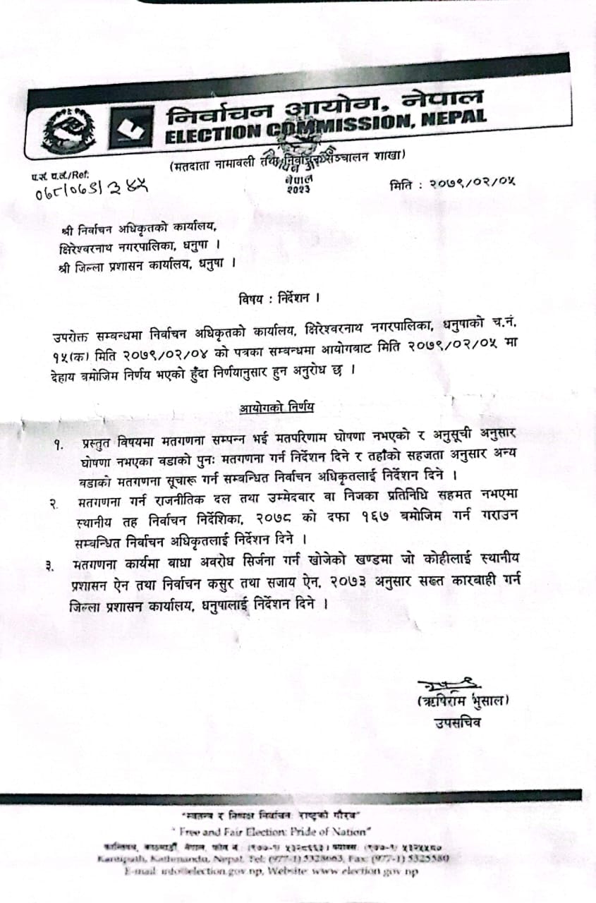 आयोगले निर्वाचन अधिकृतको कार्यालय क्षीरेश्वरनाथ र जिल्ला प्रशासन कार्यालय धनुषाको नाममा निर्देशन जारी गर्दै मतगणना सम्पन्न भइ मतपरिणाम घोषणा नभएको र अनुसूचि अनुसार घोषणामा नभएका वडाको पुन: मतगणना गर्न निर्देशन दिने र सहजता अनुसार अन्य वडाको मतगणना सुचारु गर्न सम्बन्धीत निर्वाचन अधिकृतलाई निर्देशन दिएको छ।