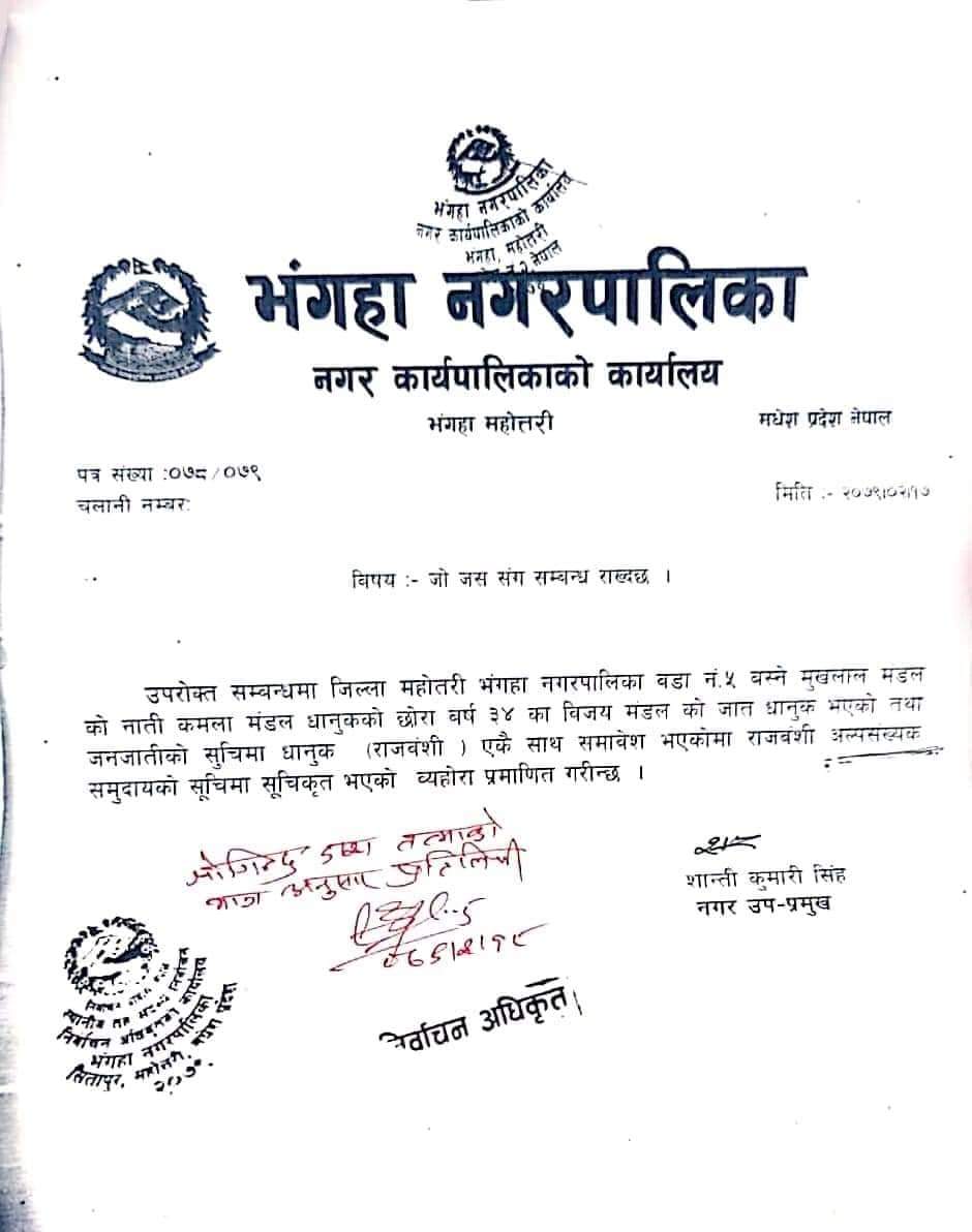 यता नवनिर्वाचित उपमेयर शान्ति कुमारी सिंहले धानुक जाति राजवंशी अल्पसंख्यक समुदायमा सूचिकृत भएको व्यहोरा लेखेर विजय मण्डलको नाम सिफारिस गरेको हुँदा मण्डलको उम्मेदवारी निर्वाचन अधिकृतको कार्यालयले गरेको निर्वाचन अधिकृत केशव अर्यालले बताए ।