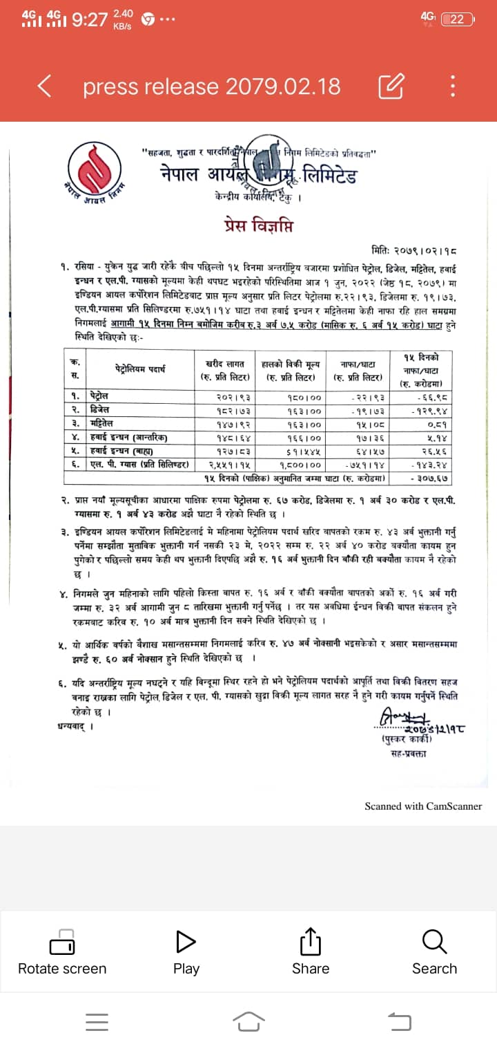 यो हिसाब हेर्दा निगमलाई अहिले पेट्रोल २ सय २ रुपैयाँ ९३ पैसा लागत परेको छ। त्यस्तै डिजेल १८२ रुपैयाँ र मट्टीतेल १ सय ४७ रुपैयाँ परेको छ। झण्डै २०३ रुपैयाँ मा किनेर निगमले १ सय ८० रुपैयाँ पेट्रोल बेचिरहेको छ। अर्थात् निगमले पेट्रोलमा प्रतिलिटर २३ रुपैयाँ घाटा देखाएको छ भने डिजेलमा करीब २० रुपैयाँ घाटा देखाएको छ।