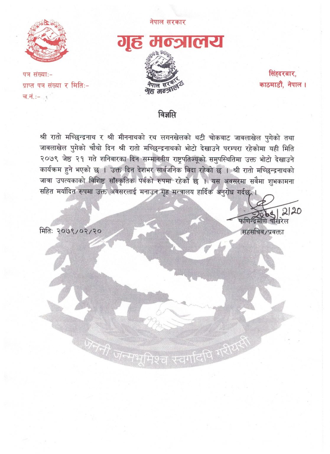 सरकारले रातो मच्छिन्द्रनाथको भोटो देखाउने दिन आज (शनिबार) सार्वजनिक बिदा दिइएको जनाएको हो ।