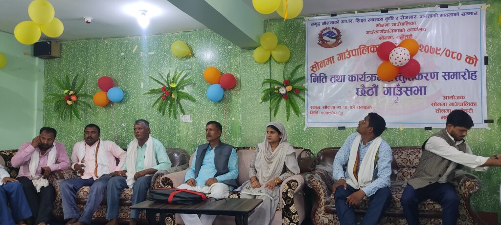 महोत्तरी - सोनमा गाँउपालिकाले आर्थिक बर्ष २०७९/०८० को अनुमानित वजेट निती तथा कार्यक्रम प्रस्तुत गरेको छ । मंगलवार गाँउपालिकाको सभाहलमा आयोजित एक समारोह बीच आर्थिक बर्ष २०७९/०८० को लागि ४३ करोडभन्दा बढि रकम बराबरको वजेट प्रस्तुत गरिएको हो ।