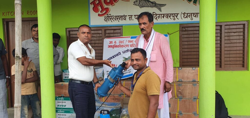 महेन्द्रनगर- धनुषा क्षिरेश्वरनाथ नगरपालिका आ.व.२०७८-०७९ मा प्रधानमन्त्री कृषि आधुनिकीकरण परियोजना द्धारा संचालित माछाको पकेट विकास कार्यक्रम अन्तर्गत ५०% अनुदानमा मोटर वितरण गरिएको छ ।
