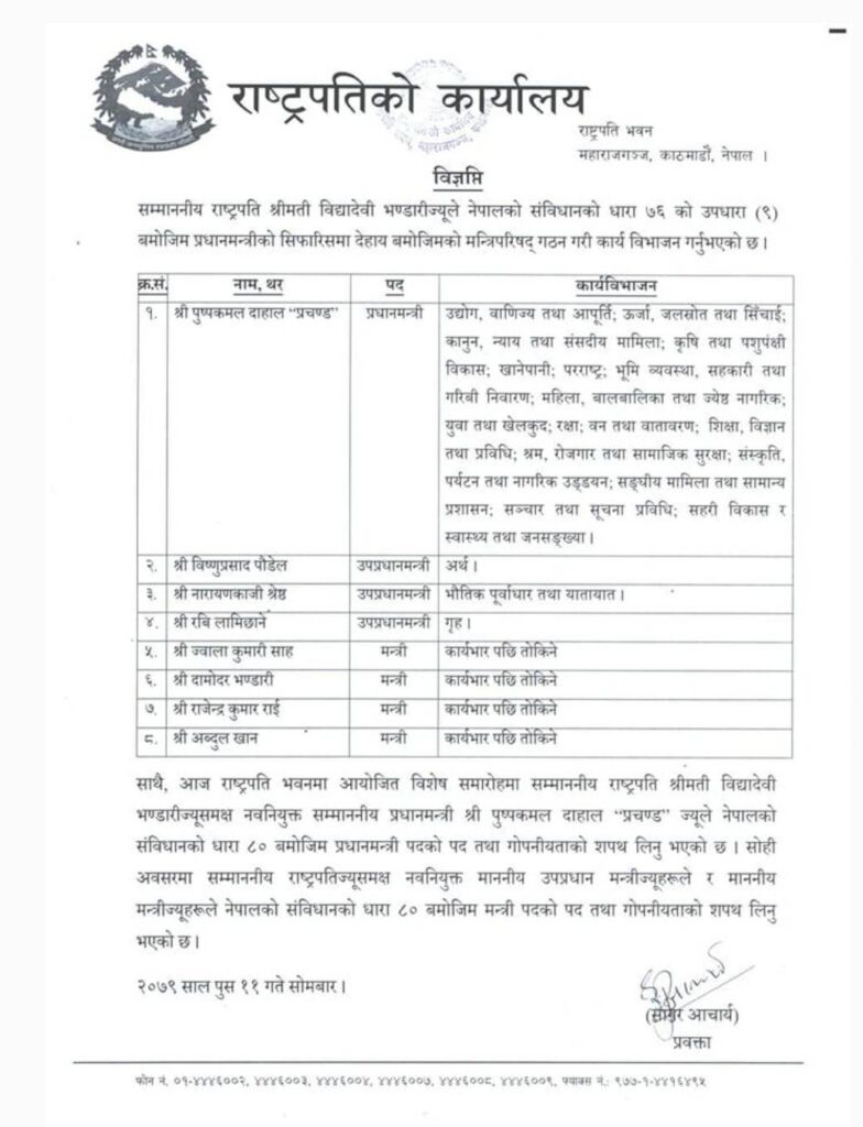 प्रचण्डसँगै तीन उपप्रधानमन्त्री र चार मन्त्रीले राष्ट्रपति कार्यालय शीतल निवासमा शपथ लिएका छन् । विष्णु पौडेल उपप्रधान र अर्थमन्त्री बनेका छन् ।