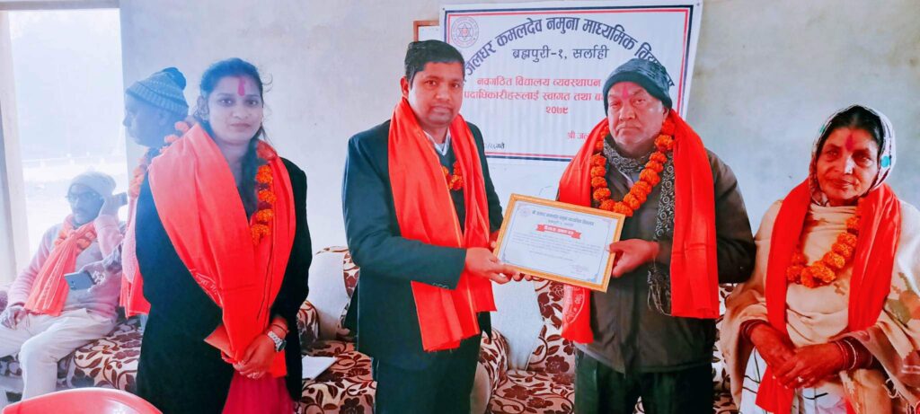 सर्लाही – जलधर कमलदेव नमूना माध्यमिक विद्यालय, ब्रह्मपुरी गापा–१, सर्लाहीद्वारा आयोजित नवगठित विद्यालय व्यवस्थापन समितिका पदाधिकारीहरुलाई बधाई तथा स्वागत कार्यक्रममा विशिष्ट अतिथि शिक्षा विकास तथा समन्वय इकाइका सुनिल कुशवाहाले नवगठित विद्यालय व्यवस्थापन समितिका पदाधिकारीहरुलाई बधाई तथा सफल कार्यकालको शुभकामना दिदैं विद्यालयको सञ्चालन, रेखदेख, निरीक्षण र व्यवस्थापन गर्ने गराउने पहिलो दायित्व विद्यालय व्यवस्थापन समितिको भएको बताएका छन् ।