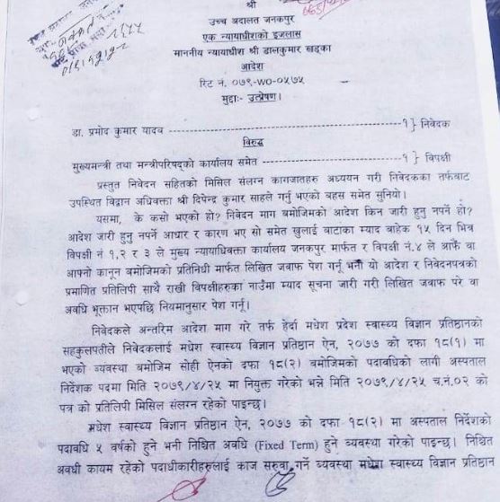 डा. यादवले मुख्यमन्त्री तथा मन्त्रीपरिषद्को कार्यालयबिरुद्ध उच्च अदालत जनकपुरमा उत्प्रेषण मुद्दा दायर गरेका थिए ।न्यायाधीश खड्काको एकल इजलासले उनको पक्षमा फैसला सुनाएको हो ।