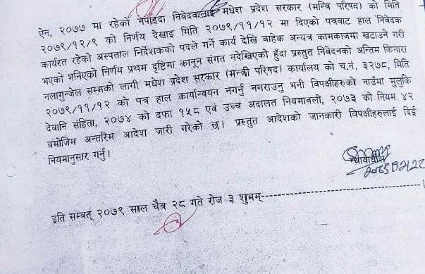जनकपुरधाम- उच्च अदालत जनकपुरले डाक्टर प्रमोद यादवलाई प्रादेशिक अस्पताल जनकपुरको निर्देशकको रुपमा कामकाज गर्न अन्तरिम आदेश जारी गरेको छ ।