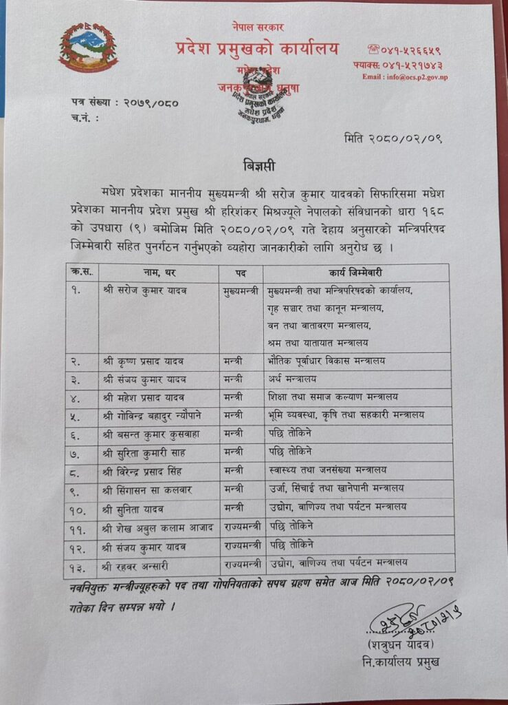 मुख्यमन्त्री सरोजकुमार यादवले नेपाली कांग्रेस र नेकपा एकीकृत समाजवादी पार्टीलाई सरकारमा सहभागी गराई मंगलबार चौथोपटक मन्त्रीपरिषद विस्तार गरेका छन् ।