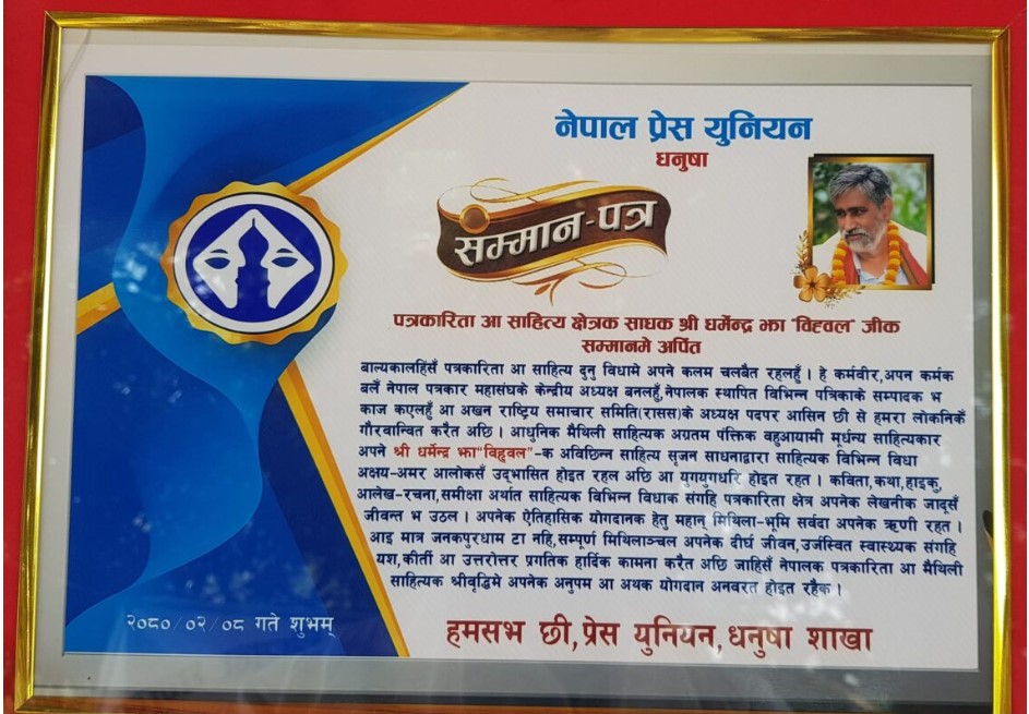 नेपाल पत्रकार महासंघको पहिलो मधेशी मुलको अध्यक्ष देखि राससको गरिमामय अध्यक्ष पद सम्मको दशकौं दशकको यात्रा, पत्रकारिता र साहित्यमा गरेको लगानी र संर्घषलाई मुल्याङ्कन गर्दै जनकपुरवासी समेत रहेको उनलाई युनियन धनुषाले सम्मान गरेको हो ।
