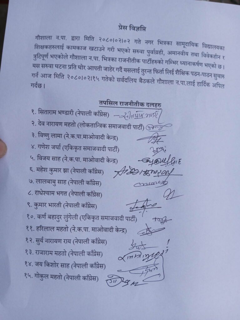 गौशला नगरपालिका भित्रका नेपाली कांग्रेस , लोकतान्त्रिक समाजवादी पार्टी , नेकपा माओवादी केन्द्र , एकीकृत समाजवादी पार्टी सम्मिलित बैठकले गौशाला नगरपालिकाले गरेको सामुदायिक विद्यालयका ९९ शिक्षकहरुको सरुवा पुर्वाग्रही र त्रुटी पूर्ण रहेको जनाएको छ ।
