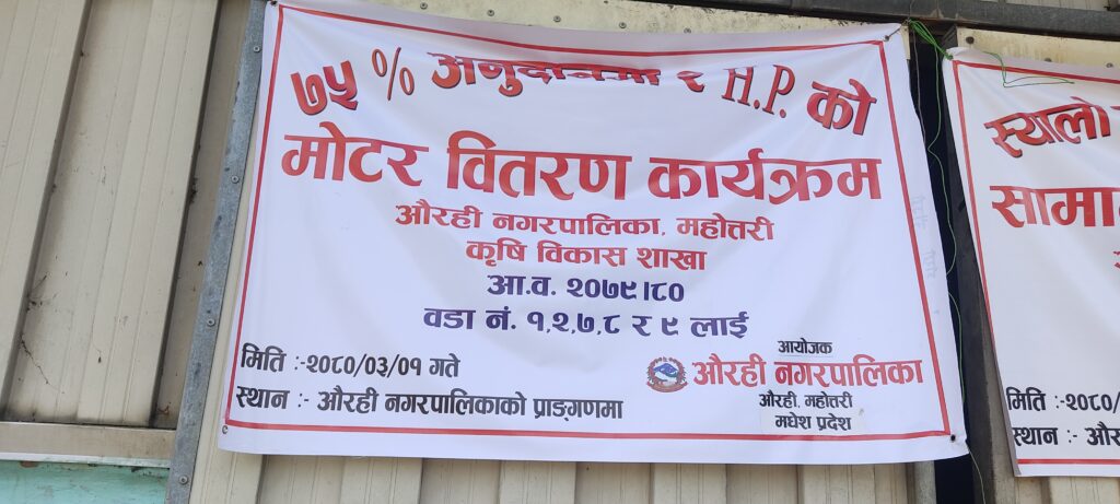 औरही नगरपालिकाले नगरपालिकाको वडा नम्बर १,२,७,८ र ९ का किसानहरुलाई मोटर वितरण गर्न सुरु गरेको हो ।