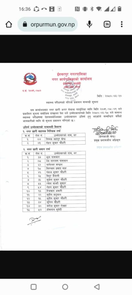 सर्लाही- सर्लाहीको ईश्वरपुर नगरपालिकामा आवेदन बिनै एक जनाको नगर प्रहरी सहायक निरीक्षकको स्वास्थ्य परिक्षणमा उतिर्ण भएको छ ।