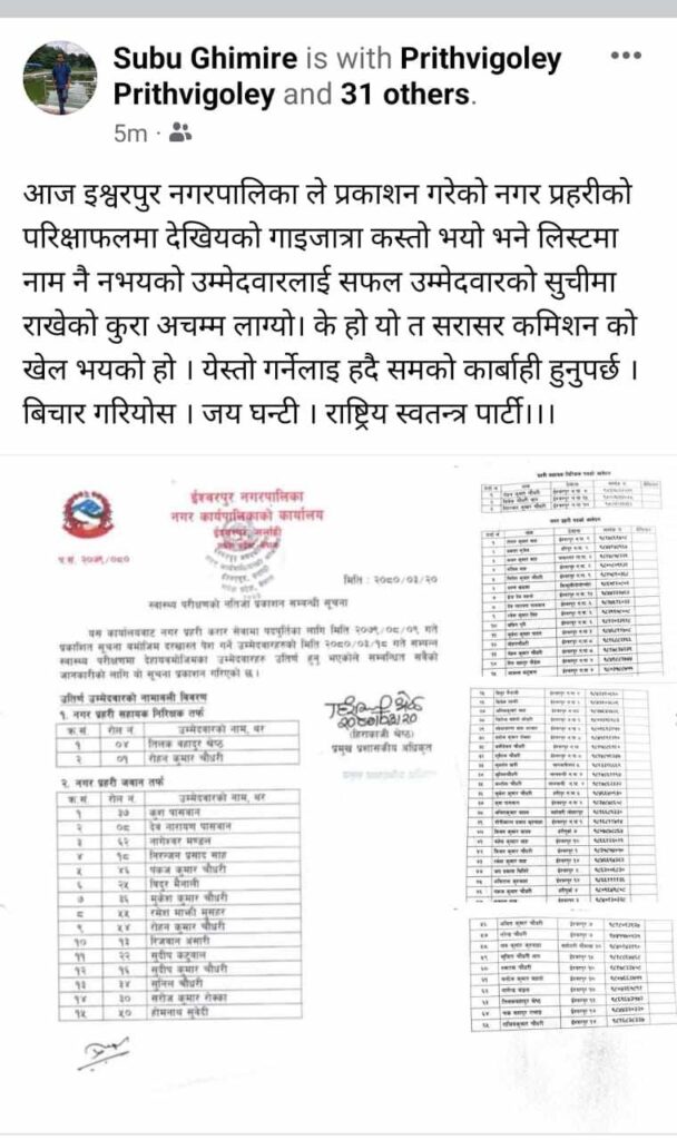 नगर सभापति घिमिरेले सोसल मिडिया मार्फत आज ईश्वरपुर नगरपालिकाले प्रकाशन गरेको नगर प्रहरीको परिक्षाफलमा देखिएको गाईजात्रा कस्तो भयो भने लिस्टमा नाम नै नभएको उममेदवारलाई सफल उममेदवारको सूचीमा राखेको कुरा अच्चम लागेको टिप्पणी समेत गरे । यस्तो सम गर्नेलाई हदैसम्मको कार्वाही हुनुपर्ने घिमिरे माग समेत गरेको छ।