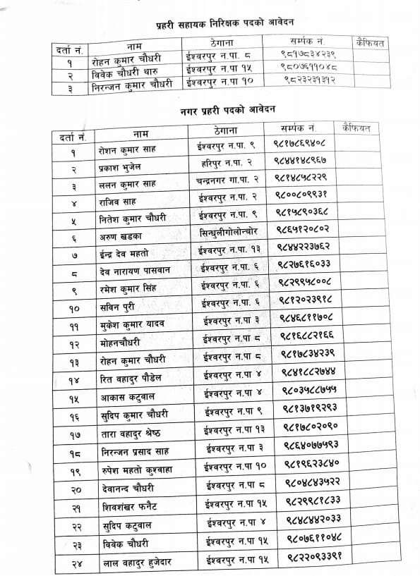 ईश्वरपुर नगरपालिकाले असार २० गते स्वास्थ्य परिक्षणको प्रकाशित गरेको सूचनामा सो तथ्य बाहिरीएको हो । नगरपालिकाका प्रमुख प्रशासकीय अधिकृत हिराकाजी श्रेष्ठले स्वास्थ्य परिक्षण परिक्षामा उतिर्ण उम्मेदवारको नामावली विवरण भएको पत्रमा हस्ताक्षर गरेर आवेदन नदिएका तिलक बहादुर श्रेष्ठको नगर प्रहरी सहायक निरीक्षकमा नाम सार्वजनिक गरेको छ ।नगर प्रहरी सहायक निरीक्षकको आवेदन फारममा ईश्वरपुर नगरपालिका वडा नं. ८ बस्ने रोहन कुमार चौधरी, वडा नं. १५ बस्ने विवेक चौधरी थारु र वडा नं. १० बस्ने निरन्जन कुमार चौधरी गरी ३ जनाले मात्र आवेदन दिएपनि स्वास्थ्य परिक्षणमा श्रेष्ठको पनि उतिर्णमा नाम आएको नगरपालिकाले जारी गरेको सूचनामा उल्लेख छ । नगरपालिकाले नगर प्रहरी करार सेवामा पदपुर्तीका लागि २०७९।८।९ गते सूचना प्रकाशित गरेको थियो र आवेदन पश्चात उम्मेदवारहरुको स्वास्थ्य परिक्षण असार १८ गते लिएको थियो । स्वास्थ्य परिक्षणमा श्रेष्ठ सहित रोहण कुमार चौधरी पनि उतिर्ण भएका थिए ।