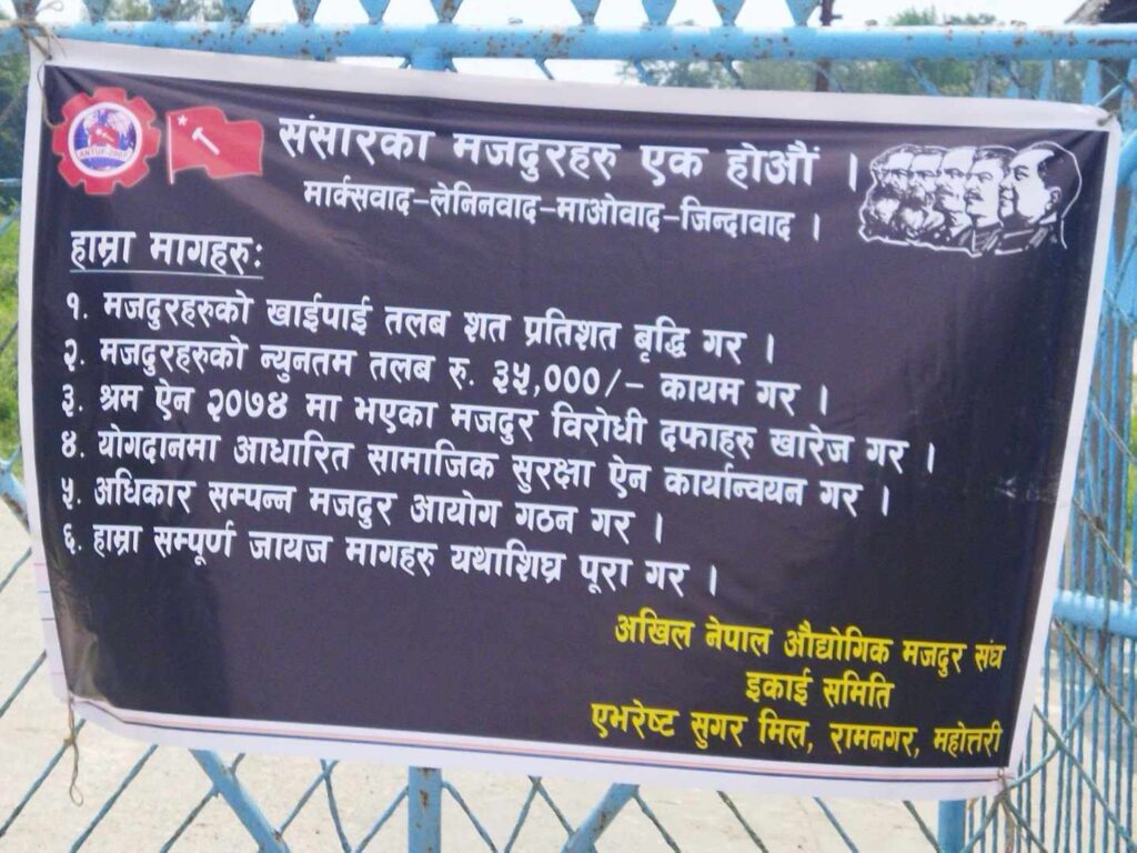 मजदुर हकहित सम्बन्धी विभिन्न माग राख्दै चिनी उद्योगमा कार्यरत मजदुरहरु आन्दोलनमा उत्रिएका छन् । पारिश्रमिक वृद्धि लगाएतका माग सहित मजदुरहरुले आन्दोलन सुुरु गरेका हुन् ।