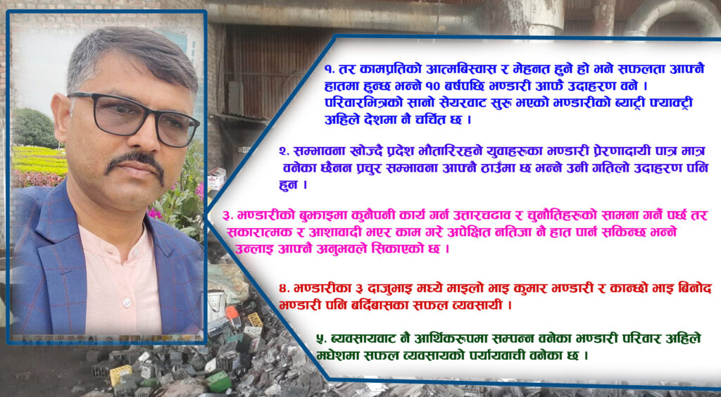 तर कामप्रतिको आत्मबिस्वास र मेहनत हुने हो भने सफलता आफ्नै हातमा हुन्छ भन्ने १० बर्षपछि भण्डारी आफै उदाहरण वने । परिवारभित्रको सानो सेयरवाट सुरु भएको भण्डारीको ब्याट्री फ्याक्ट्री अहिले देशमा नै चर्चित छ ।