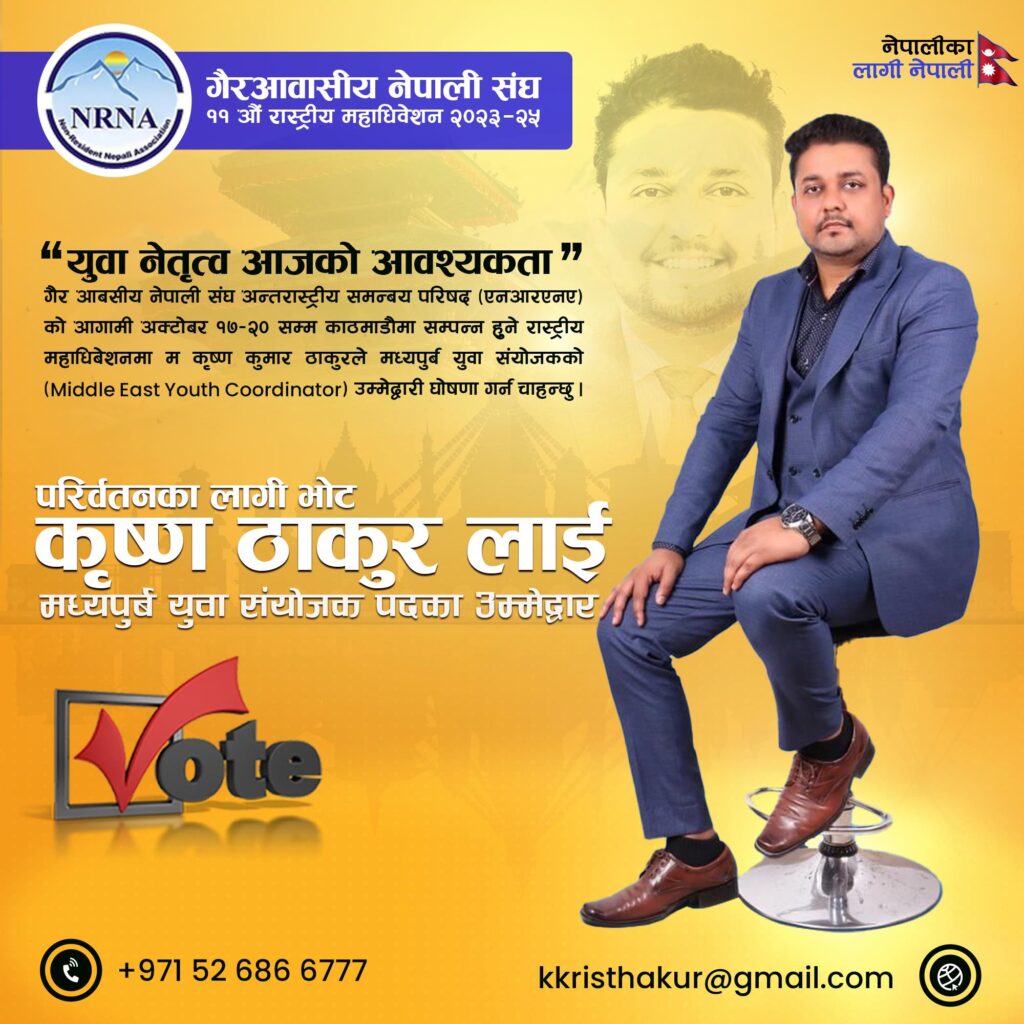 गैर आबसीय नेपाली संघ अन्तराष्ट्रिय समन्बय परिषद (एनआरएनए) को आगामी अक्टोबर १७-२० सम्म काठमाडौमा सम्पन्न हुने राष्ट्रिय महाधिबेशनमा धनुषाकाे क्षीरेश्वरनाथ नगरपालिका निवासी कृष्ण कुमार ठाकुरले मध्यपुर्ब युवा संयोजकको (Middle East Youth Coordinator) उम्मेदवारी घोषणा दिएका छन्।
