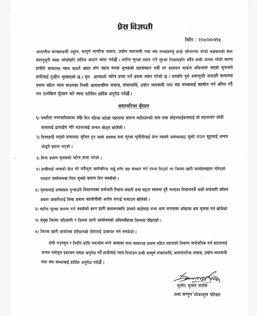 परिवारका एक सदस्य सुमोदकुमार सर्राफले एक विज्ञप्ति जारी गर्दै घटनालाई अन्यत्र मोड्न प्रहरीले मृतकको चरित्रहत्या गरेको आरोप लगाए।