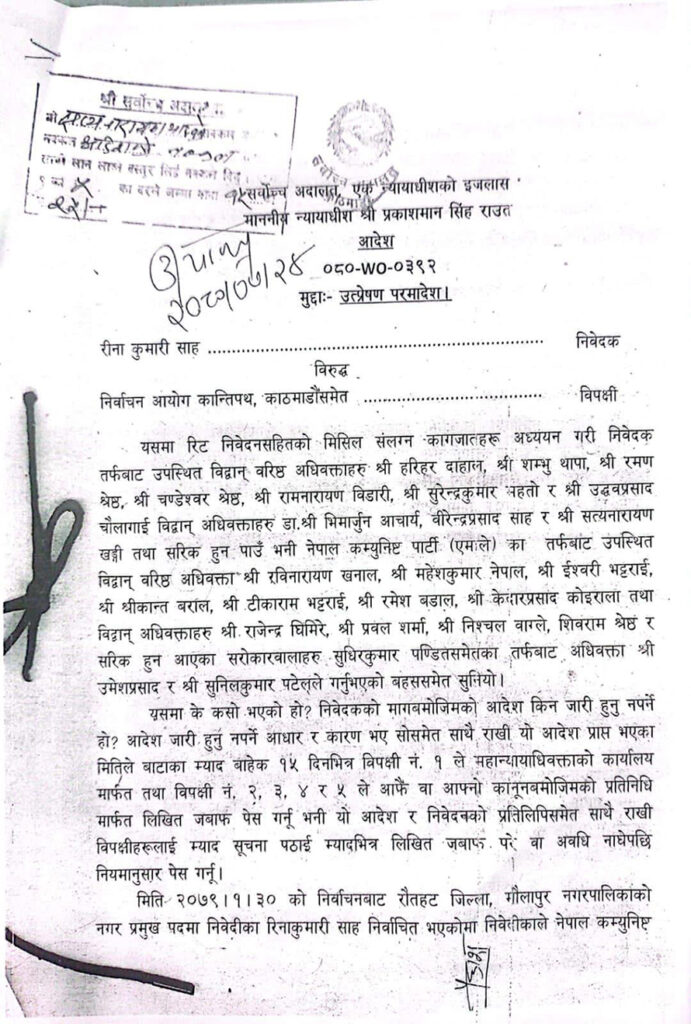 न्यायाधीश प्रकाशमान सिंह राउतको एकल इजलासले साहलाई पदमुक्त गर्न एमालेले गरेको पत्रचार र निर्वाचन आयोगले गरेको निर्णय कार्यान्वयन नगर्न अन्तरिम आदेश दिएको हो ।