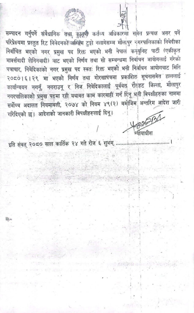 स्थानीय नगर प्रमुखले संविधानको धारा २१८ बमोजिम सम्पादन गर्नुपर्ने संवैधानिक तथा कानुनी कर्तव्य अधिकारमा समेत प्रत्यक्ष असर पर्ने भन्दै सर्वोच्चले मुद्दाको अन्तिम टुंगो नलागेसम्म साहलाई पदमुक्त गर्ने निर्णय कार्यावयन नगर्न अन्तरिम आदेश दिएको छ ।