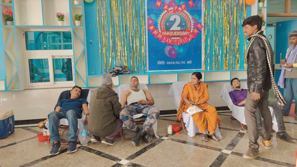 रक्तदान कार्यक्रम हस्पिटलको परिसरमा गरिएको थियो । “रक्तदान गरौँ जीवन बचाऔँ र हाम्रो खेर जाने रगत दान गर्दा कसैको जीवन बाँच्छ” भन्ने नारा सहित हस्पिटलले आयोजना गरेकाे रक्तदान कार्यक्रममा ६० जनाले रक्तदान गरेको हस्पिटलका प्रशासन प्रमुख संजय यादवले बताए ।