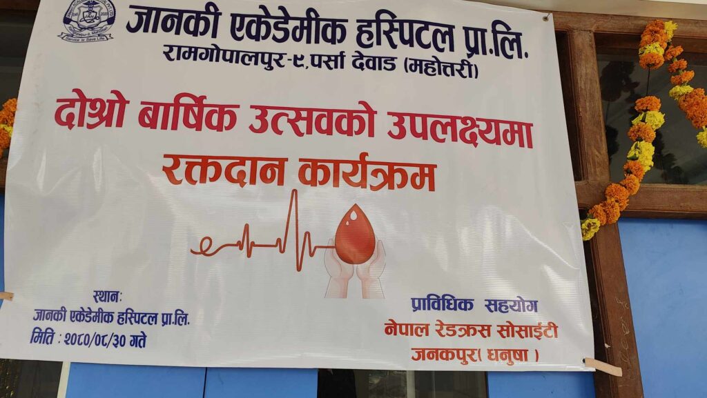 महोत्तरी- जानकी एकेडेमीक हस्पिटल प्रा.लि.ले आफ्नो दोस्रो स्थापना दिवस बृहद् रक्तदान कार्यक्रमको आयोजना गरी मनाएकाे छ । महोत्तरीको औरही , रामगोपालपुर नगरपालिका, सोनमा र सम्सी गाउँपालिकाको बीचमा पर्ने स्थानमा रहेकाे जानकी एकेडेमीक हस्पिटलको आयोजनामा रक्तदान कार्यक्रम गरिएको हो ।