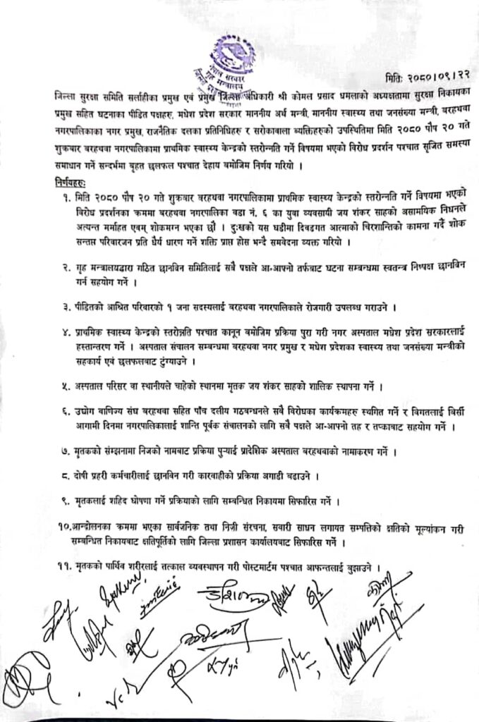 जनकपुरधाम। सर्लाहीको बरहथवा घटना विषयमा ११ बुँदे सहमति भएको छ । अस्पताल स्तरोन्नति गर्नुपर्ने आन्दोलनरत्त पक्ष, मृतक पक्ष र प्रशासनबीच ११ बुँदे सहमति भएको हो ।