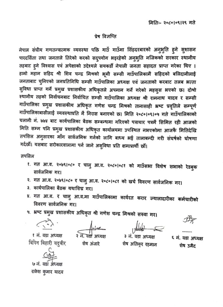 वडाध्यक्षहरुले विज्ञप्ति निकाल्दै गाउँसभा विशेष सभाको रेडबुक सार्वजनिक गर्नुपर्ने, आर्थिक वर्ष ०७९/८० र आर्थिक वर्ष ०८०/८१ को खर्च विवरण सार्वजनिक गर्नुपर्ने, कार्यपालिका बैठक यथाशिघ्र बस्नुपर्ने, गाउँपालिकामा कार्यरत ज्यालादारीका कर्मचारीको विवरण सार्वजनिक गर्नुपर्ने र प्रशासकीय अधिकृतको तत्काल सरुवा गर्नुपर्ने माग राख्दै गाउँपालिकाको कार्यालयमा आइतबार तालाबन्दी गरेको हो ।