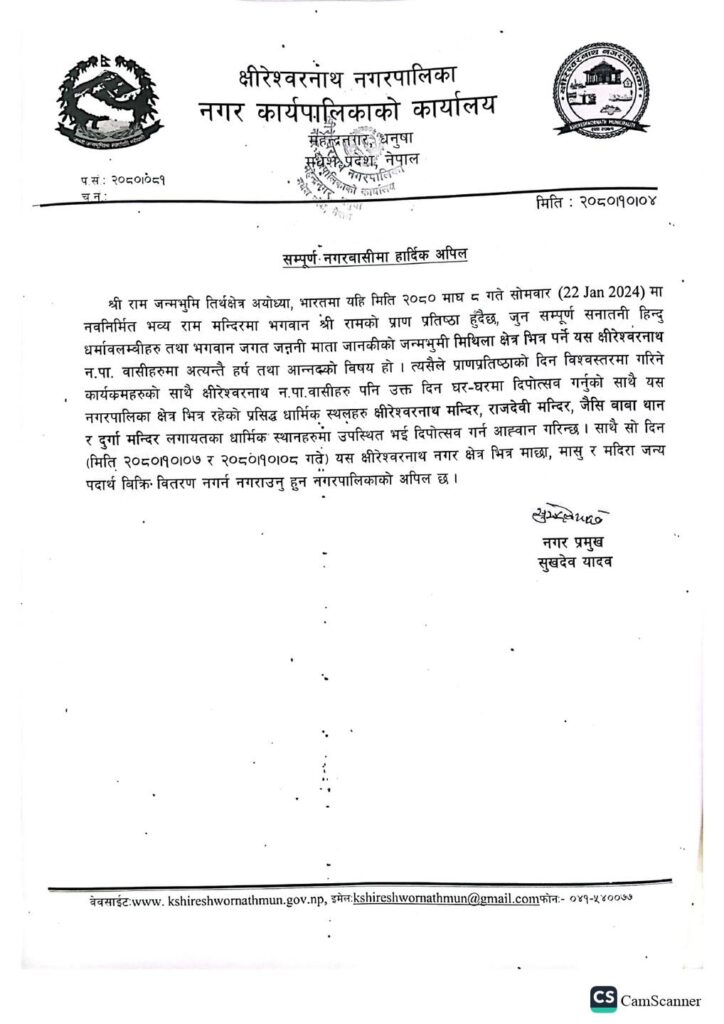 निकालिएको अपिल पत्रमा श्री राम जन्मभुमी तिर्थक्षेत्र अयोध्या भारतमा यहि मिति २०८० माघ ८ गते सोमवार नवनिर्मित भव्य राम मन्दिरमा भगवान श्री रामको प्राण प्रतिष्ठा हुँदैछ, जुन सम्पुर्ण सनातनी हिन्दु धर्मावलम्वीहरु त्था भगवान जगत जननी माता जानकीको जन्मभुमी मिथिला क्षेत्र भित्र पर्ने यस क्षीरेश्वरनाथ नगरपालिका वासीहरुमा अत्यन्तै हर्ष तथा आन्नदको विषय हो । त्यसैले प्राणप्रतिष्ठाको दिन विश्वस्तरमा गरिने कार्यक्रमहरुको साथै क्षीरेश्वरनाथ नगरपालिका वासीहरु पनि उक्त दिन घरघरमा दिपोत्सव गर्नुको साथै यस नगरपालिका क्षेत्र भित्र रहेको प्रसिद्ध धार्मिक स्थलहरु क्षीरेश्वरनाथ मन्दिर, राजदेवी मन्दिर, जैसि बाबा थान र दुर्गा मन्दिर लगायतका धार्मिक स्थानहरुमा उपस्थित भई दिपोत्सव गर्न आह्वान गरिन्छ ।