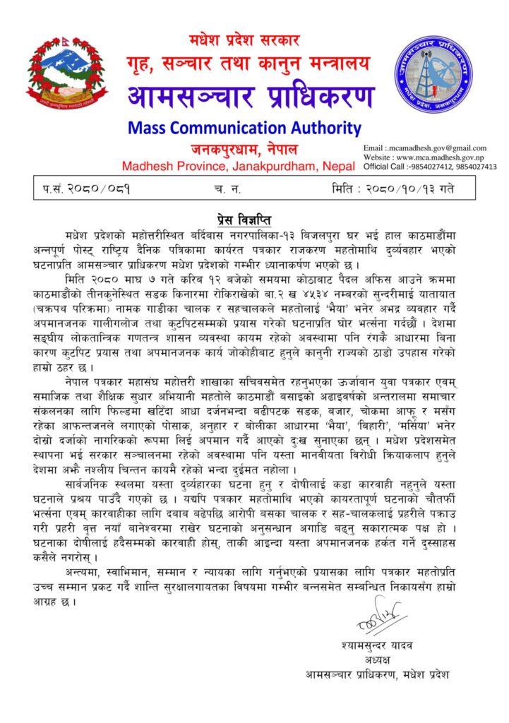 काठमाडौं – मधेस प्रदेश सरकार मातहत रहेको आमसञ्चार प्राधिकरणले स्वाभिमान, सम्मान र न्यायका लागि गरेको प्रयासका लागि पत्रकार राजकरण महतोप्रति उच्च सम्मान प्रकट गरेको छ । प्राधिकरणका अध्यक्ष श्यामसुन्दर यादवले शनिवार प्रेस विज्ञप्ती जारी गर्दै गत आईतबार पत्रकार महतोमाथि दुव्र्यवहार भएको घटनाप्रति गम्भीर ध्यानाकर्षण भएको जनाएका छन् । देशमा संघीय लोकतान्त्रिक गणतन्त्र शासन व्यवस्था कायम रहेको अवस्थामा पनि रंगकै आधारमा बिनाकारण कुटपिट प्रयास तथा अपमानजनक कार्य जोकोहीबाट हुनुले कानुनी राज्यको ठाडो उपहास गरेको उल्लेख गरेका छन् ।
