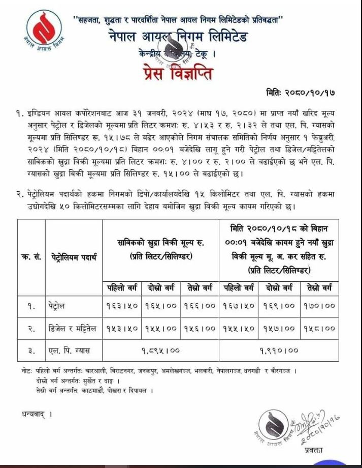 बुधवार बसेको निगम सञ्चालक समितिले माघ १८ गते बिहान १ बजेदेखि लागू हुने गरी पेट्रोल, डिजेल र एलपी ग्यासको मूल्य वृद्धि गरेको हो ।