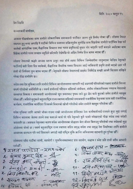 समाजिक सञ्जालमा एक विज्ञप्ती जारी गर्दै १४ जना नेताहरुले लोसपा सहि तरिकाबाट चल्न नसकेको र नेतृत्व प्रभावकारी नभएको भन्दै केन्द्रिय देखि जिल्ला तहका गरि १४ जना नेताहरुले हस्ताक्षर गरि सामुहिक रुपमा पार्टी परित्यागको घोषणा गरेको हो ।