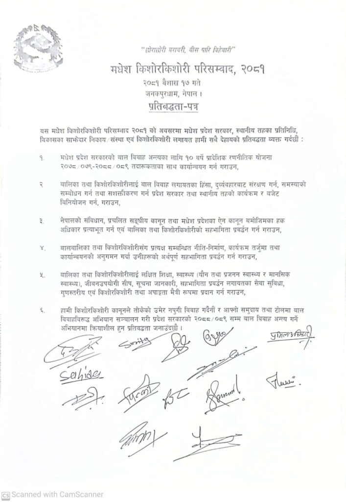 मधेश प्रदेशको राजधानी जनकपुरधाममा सम्पन्न कार्यक्रममा बालविवाह विरुद्धको ६ बुँदे प्रतिबद्धता पत्र जारी गरिएको थियो भने बालविवाह अन्त्यका लागि किशोरकिशोरी अन्तरसम्वाद, बालविवाह विरुद्धको नाटक प्रस्तुति, बालविवाह मुक्त घोषणा भएका (सप्तरीका सुरुङ्गा र खडक नगरपालिका) स्थानीय तहहरुलाइ सम्मान, बालविवाह विरुद्धको अभियानमा सहयोग गर्ने विभिन्न संघसंस्थाहरुलाइ कदरपत्र प्रदान गरिएको थियो ।