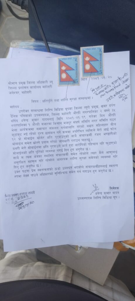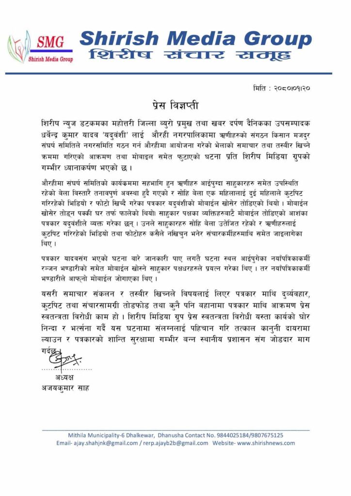 शिरीष न्युज डटकमका महोत्तरी जिल्ला ब्युरो प्रमुख तथा खबर दर्पण दैनिकका उपसम्पादक धर्वेन्द्र कुमार यादव ’यदुवंशी’ माथि भएको आक्रमण तथा मोबाइल फुटाउने घटनामा संलग्न उपर कार्वाहीको माग गरिएको छ।