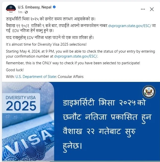 वैशाख २२ गते (भोलि) राति ९ बजेबाट आफ्नो कनफरमेसन नम्बर dvprogram.state.gov/ESC मा गई नतिजा हेर्न सक्ने दूतावासले जनाएको छ ।