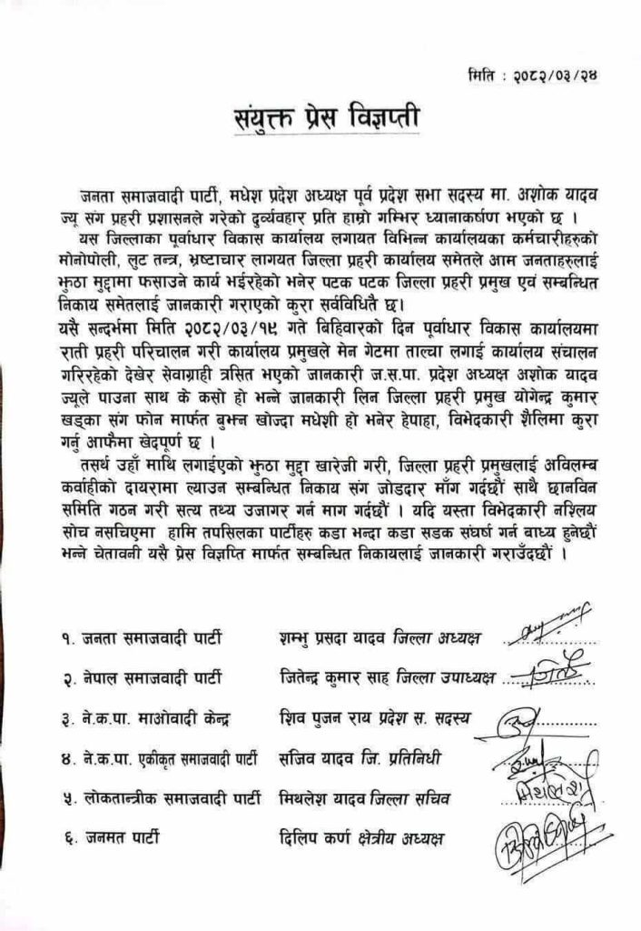 महोत्तरी - जनता समाजवादी पार्टी मधेश प्रदेशका अध्यक्ष तथा पूर्व प्रदेशसभा सदस्य अशोक यादवमाथि लगाइएको मुद्दा तत्काल खारेज गर्न माग गर्दै ६ वटा राजनीतिक दलले संयुक्त प्रेस विज्ञप्ति जारी गरेका छन्। सोमबार सार्वजनिक गरिएको विज्ञप्तिमा उनीहरूले सर्लाहीका प्रहरी प्रमुखमाथि जातीय पूर्वाग्रहका आधारमा दुर्व्यवहार गरेको आरोप लगाएका छन्।