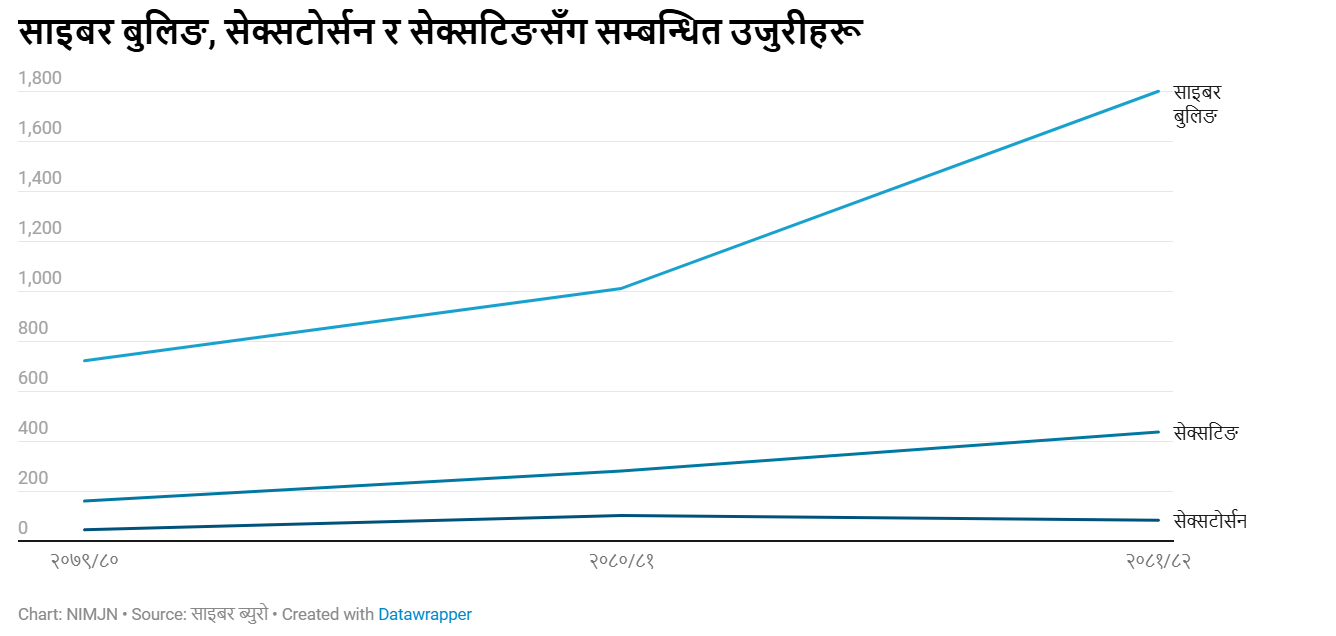 साइबर ब्युरोको तथ्यांकअनुसार आर्थिक वर्ष २०७९/२०८० मा यस्ता ९ सय २९ उजुरी दर्ता भएका छन् । त्यस्तै आर्थिक वर्ष २०८०/२०८१ मा १ हजार ३ सय ९६ वटा र आर्थिक वर्ष २०८१/२०८२ मा २ हजार ३ सय २२ वटा उजुरीहरू दर्ता भएका छन् । यी उजुरीहरू साइबर बुलिङ, सेक्सटोर्सन र सेक्सटिङसँग सम्बन्धित छन् ।
