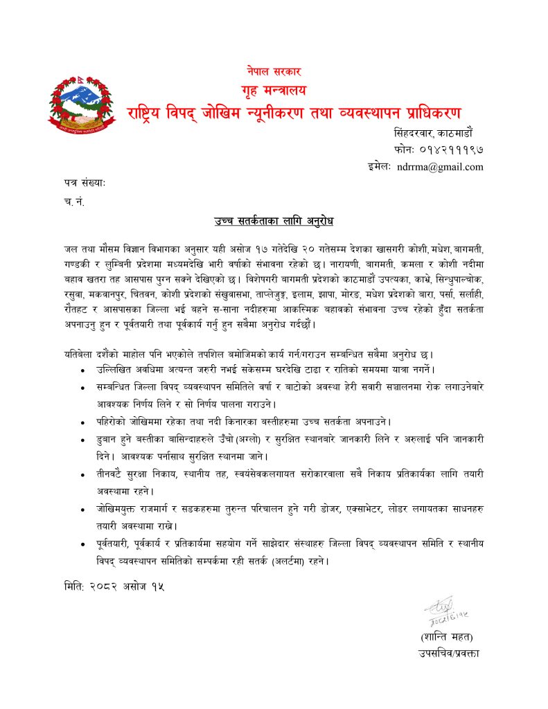 जल तथा मौसम विज्ञान विभागले असोज १७ गतेदेखि २० गतेसम्म भारी वर्षा हुने प्रक्षेपण गरेपछि राष्ट्रिय विपद् जोखिम न्यूनीकरण तथा व्यवस्थापन प्राधिकरणले अलर्ट जारी गरेको छ। विभागका अनुसार कोशी, मधेश, बागमती, गण्डकी र लुम्बिनी प्रदेशमा मध्यमदेखि भारी वर्षाको सम्भावना रहेको छ।