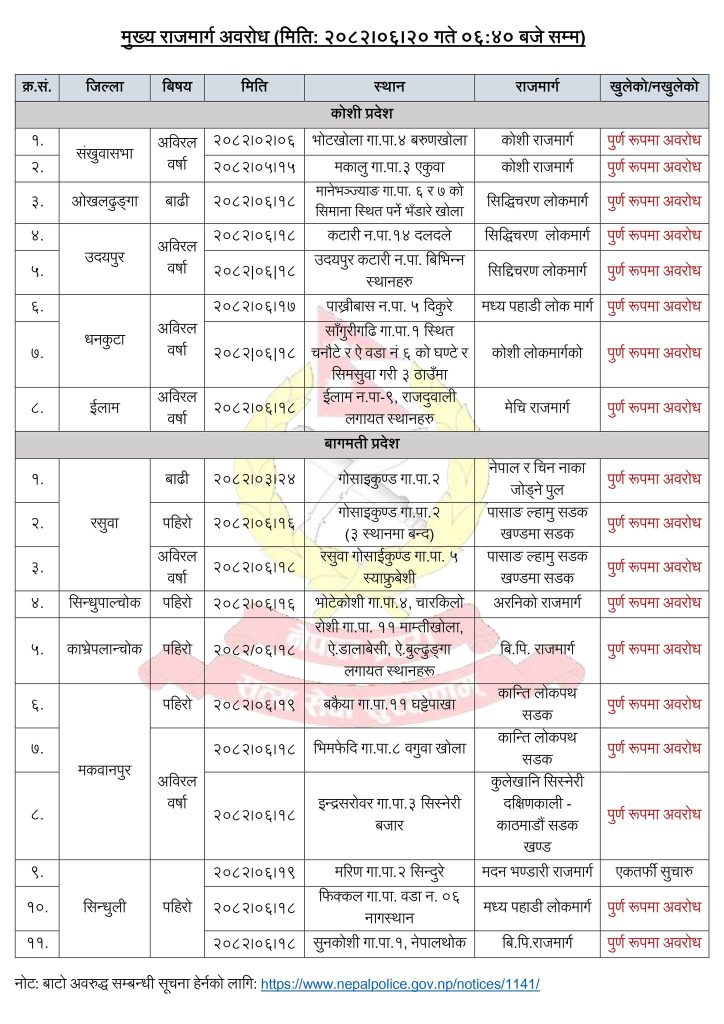 कुन राजमार्ग कहाँकहाँ छ अबरुद्ध?