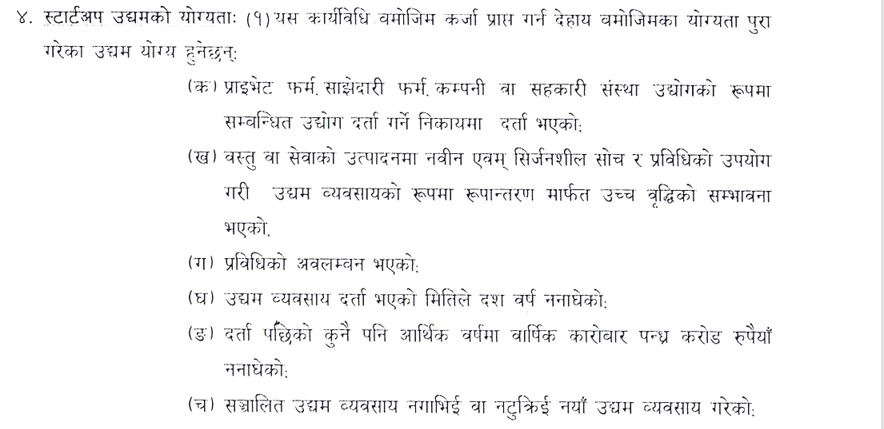 त्यस्तै, नयाँ कम्पनी, प्राइभेट फर्म वा साझेदारी फर्मको रूपमा दर्ता भएको हुनुपर्ने, वस्तु वा सेवाको उत्पादनमा नवीन सोच र प्रविधि प्रयोग भएको, छिटो स्तरोन्नति सम्भावना भएको, दर्ता भएको मितिले १० वर्षको अवधि ननाघेको हुनुपर्ने उल्लेख छ ।