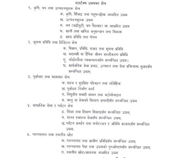 त्यस्तै, पहिलो संशोधनमार्फत स्टार्टअप उद्यमको योग्यतामा प्रविधिको अवलम्बन भएको, सञ्चालित उद्यम व्यवसाय नगाभिई वा नटुक्रिई नयाँ उद्यम व्यवसाय गरेको हुनुपर्नेछ पनि भनिएको छ । कृषि तथा पशुपन्छी, वन पैदावार, पर्यटन प्रवर्द्धन तथा मनोरञ्जन र अतिथि सत्कार, विज्ञान, प्रविधि, सूचना तथा सञ्चार, मानव स्वास्थ्य सेवा, शिक्षा तथा शिक्षण सिकाइ, अटोमोबाइल, परम्परागत प्रविधि, उत्पादन र सेवा प्रवाहको प्रक्रिया सुधार, घरायसी वा दैनिक जीवनयापन, खाद्य उत्पादन तथा प्रशोधन, सहज र सुरक्षित यातायात तथा पारवहन सेवा, खानी तथा खनिज अनुसन्धान र विकाससँग सम्बन्धित व्यवसायलाई स्टार्टअप उद्यमको क्षेत्र भनिएको छ ।