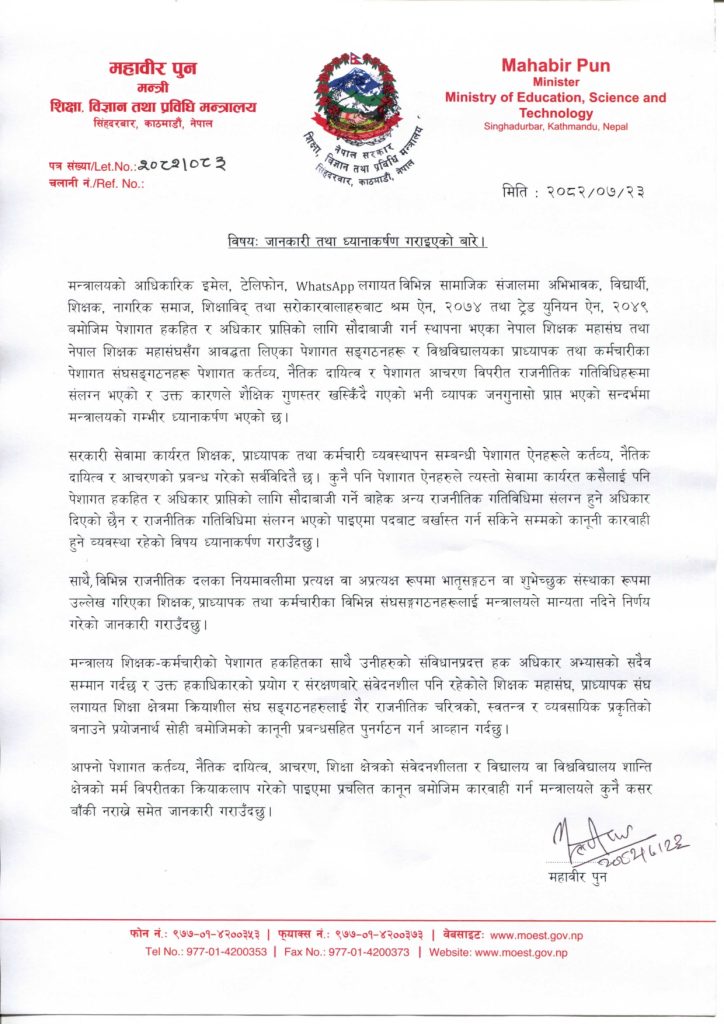 शिक्षा, विज्ञान तथा प्रविधि मन्त्री महावीर पुनले आइतबार विज्ञप्ति जारी गर्दै राजनीतिक दलका भ्रातृ संगठन वा शुभेच्छुक संस्थाका रूपमा उल्लेख गरिएका शिक्षक, प्राध्यापक र कर्मचारीका संघसंगठनलाई मन्त्रालयले मान्यता नदिने र बर्खास्त गर्ने चेतावनी दिएका हुन्।