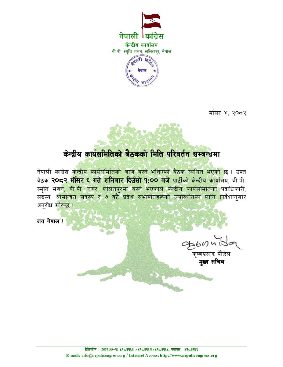 अब बैठक मंसिर ६ गते शनिबार दिउँसो १ः०० बजे पार्टीको केन्द्रीय कार्यालय, सानेपामा बस्ने भएको मुख्य सचिव कृष्णप्रसाद पौडेलले जानकारी दिए।