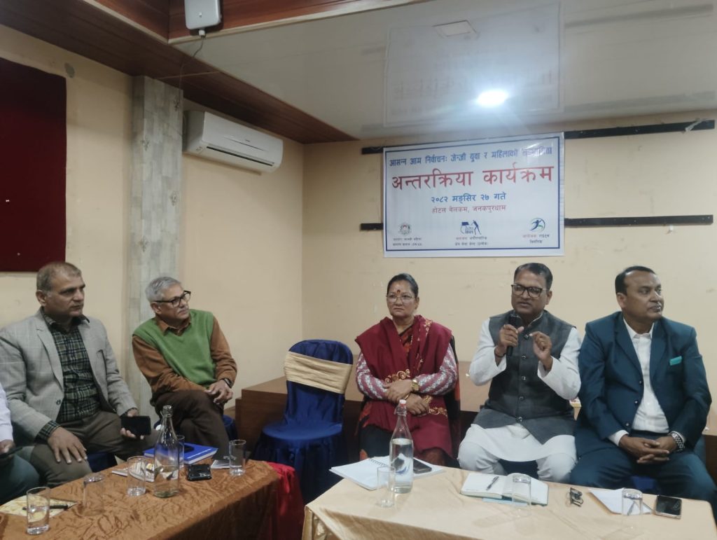 अनौपचारिक क्षेत्र सेवा केन्द्र (इन्सेक) को समन्वय, जानकी महिला जागरण समाजको सहयोग तथा राइट्स क्लिनिकको आयोजनामा आज जनकपुरधाममा सम्पन्न “आसन्न आम निर्वाचनः जेनजी युवा र महिला सहभागिता” विषयक अन्तरक्रिया कार्यक्रममा सम्बोधन गर्दै उहाँले निर्वाचनको अनुगमनमा आजैदेखि सबै सरोकारवाला सक्रिय हुनुपर्नेमा जोड दिनुभयो।