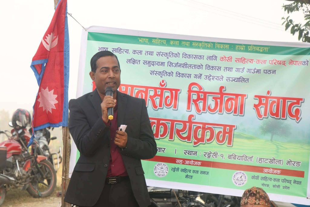 विराटनगर । सिर्जनशीलताका विकास गर्दै साहित्यलाई गाउँ गाउँसम्म पुर्याउने उद्देश्यले सञ्चालित ‘कोसी साहित्य–कला परिषद् नेपाल’ को ‘किसानसँग सिर्जना संवाद’ कार्यक्रम सम्पन्न भएको छ । रङ्गेली साहित्य कला समाज, मोरङ सहआयोजक तथा रङ्गेली नगरपालिकाको सहकार्यमा उक्त कार्यक्रम सम्पन्न भएको हो ।