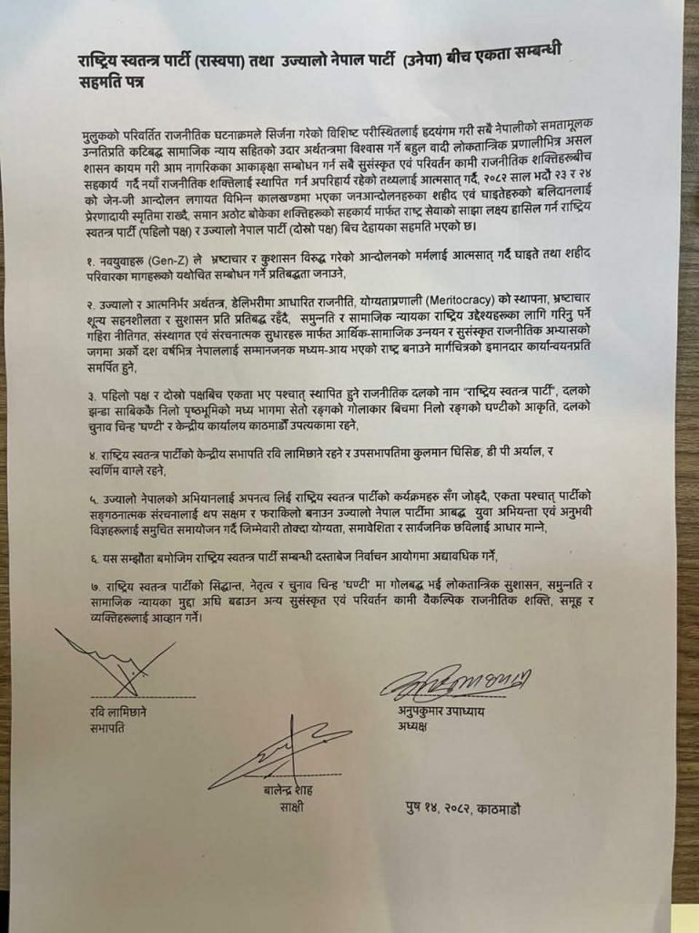 काठमाडौँ — उज्यालो नेपालका संरक्षक कुलमान घिसिङ, राष्ट्रिय स्वतन्त्र पार्टीका सभापति रवि लामिछाने र बालेन शाह एउटै दल भएर निर्वाचनमा जान सहमत भएका छन्।